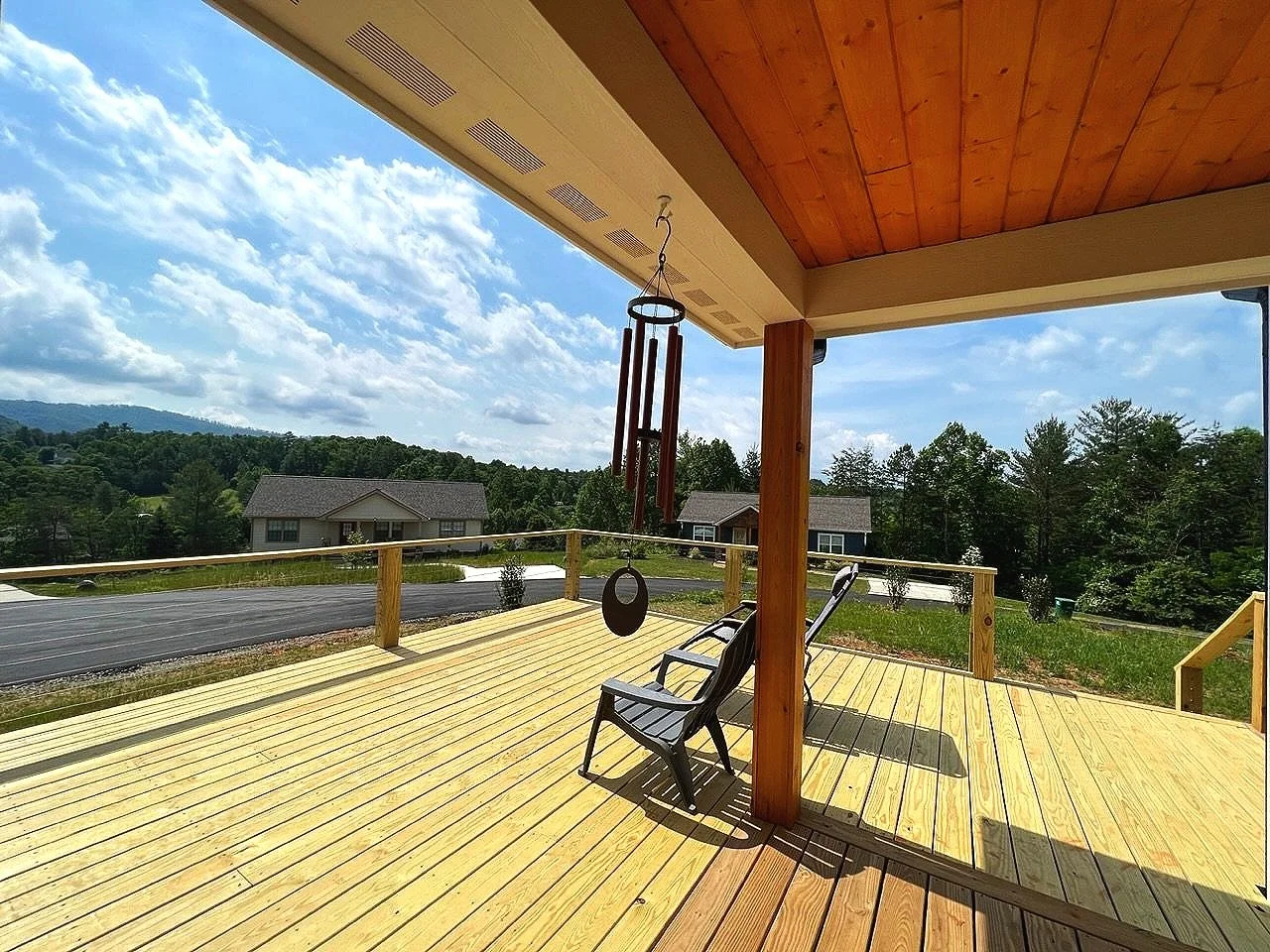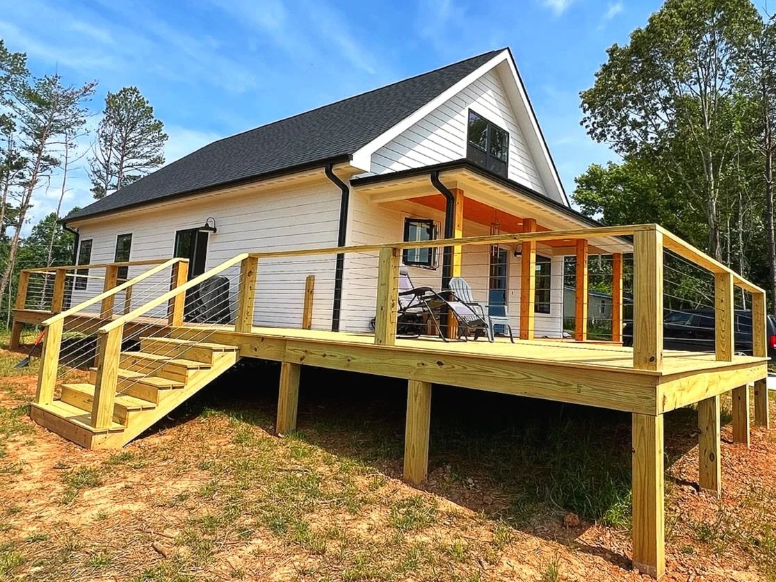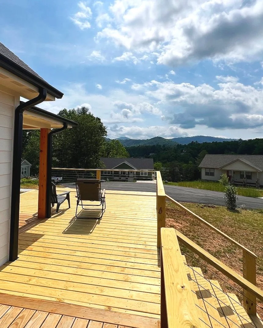 This was a new construction home just purchased by our client when they called us out to talk about expanding their outdoor living space. The deck addition design we settled on added roughly 300 square feet of deck space, combined the existing deck and covered front porch, and maximized their beautiful mountain range view from the front of their property through the configuration of the deck and the use of cable bullet’s “wooden post cable railing kit”. We exchanged the hogwire railing on the existing deck with cable railing for a uniform finish, and added a stair set for the client to have convenient yard and garden access.