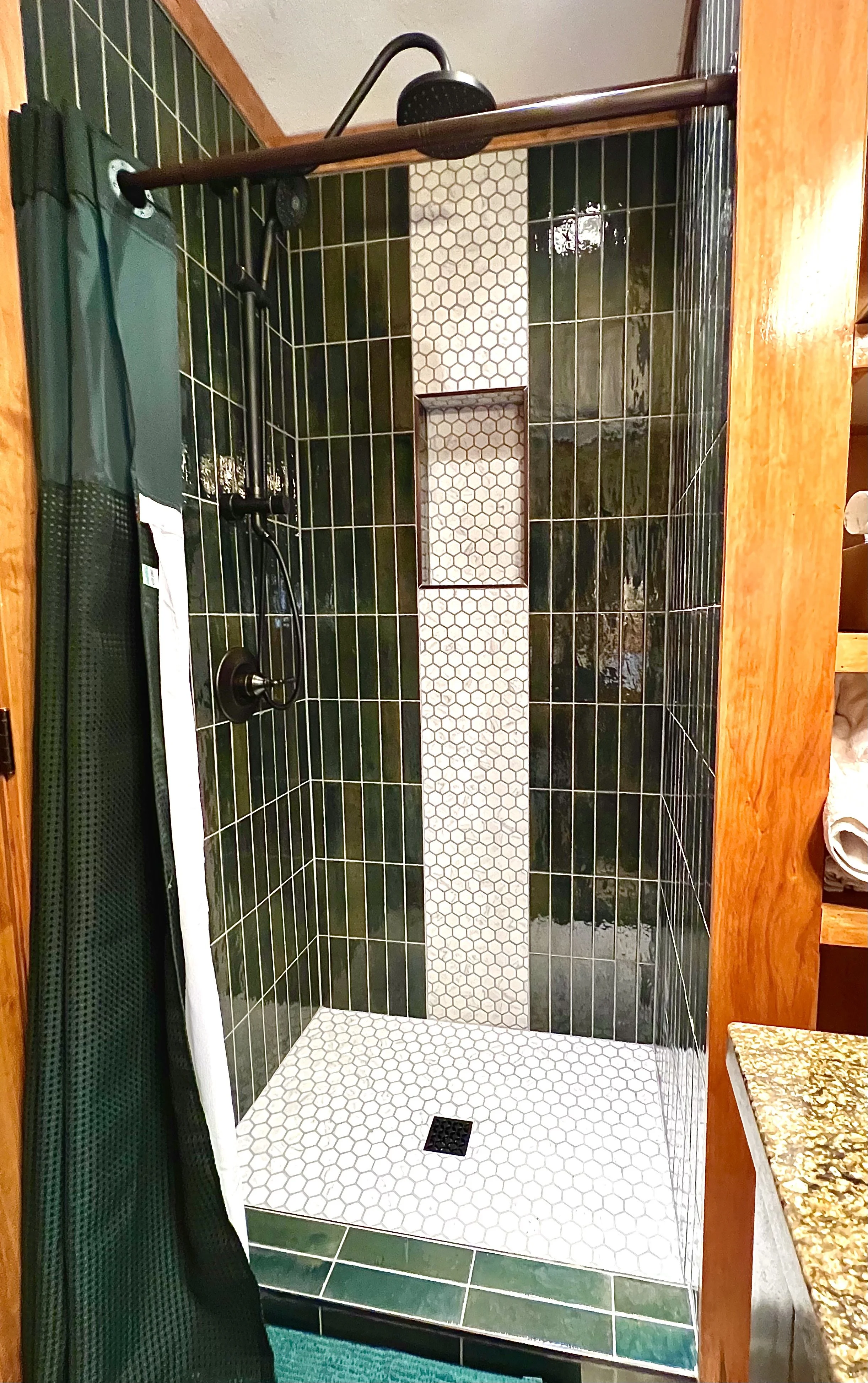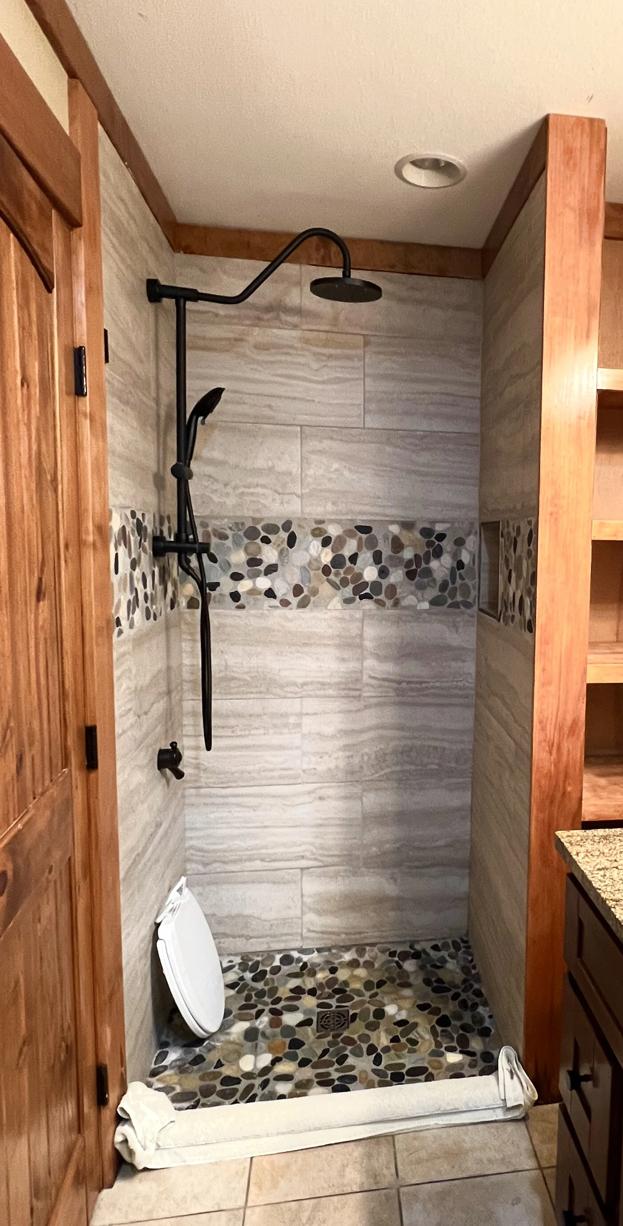 Our client reached out to us after closing on a new home and discovering that their guest bath shower pan and fixtures were leaking. After replacing the shower pan, waterproofing, and repairing leaks, we laid new wall and floor tile and gave this shower an upgraded aesthetic.